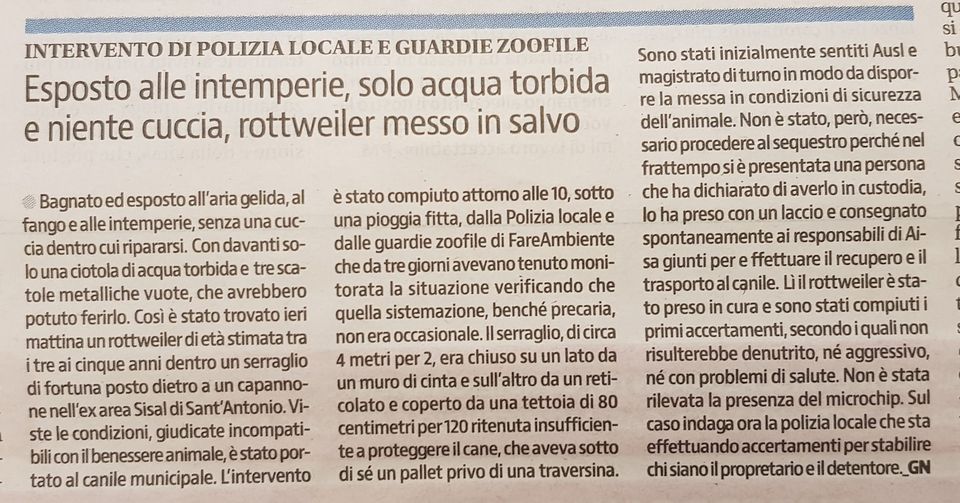 Rottweilr messo in salvo dalla Polizia Locale e dalle Guardie Ecozoofile del Laboratorio Verde di Fare Ambiente di Piacenza